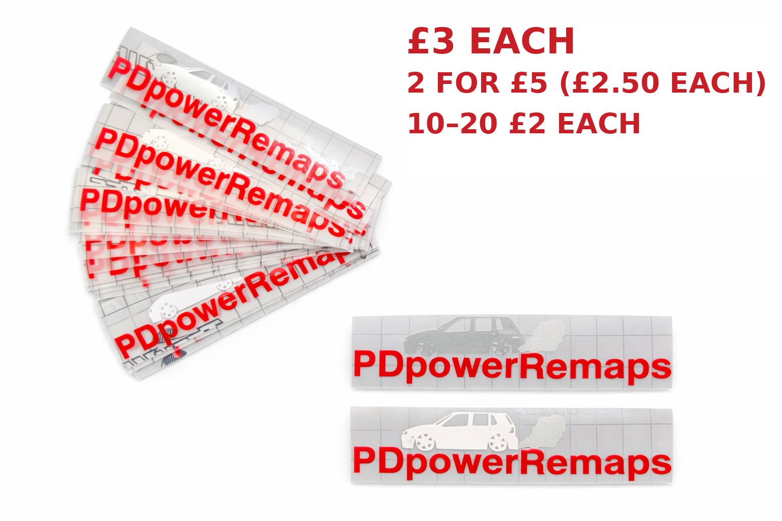 These stickers feature a MK4 Golf silhouette with smoke detail and bold PDpower Remaps branding, making them perfect for rear windows, side glass, or body panels.